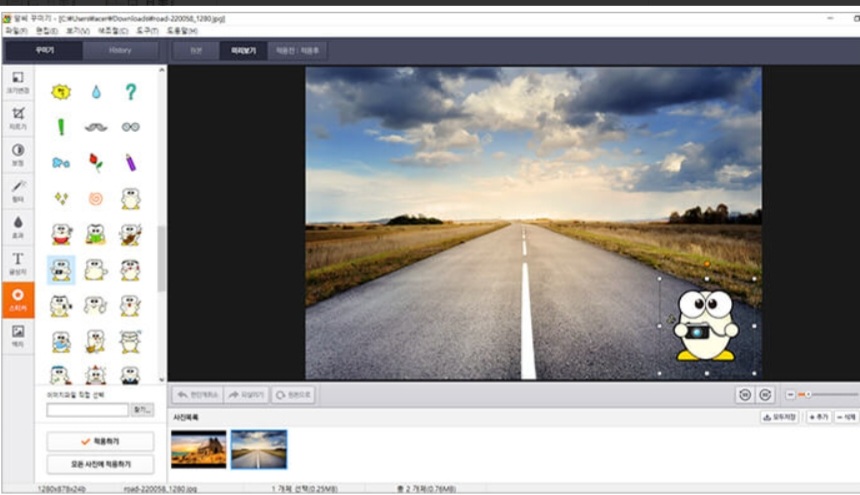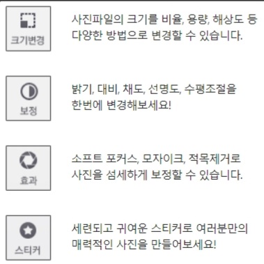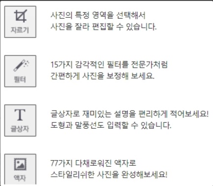 보정, 효과, 스티커, 글상자, 액자 등을 사용해 이미지를 꾸미기 할 수 있습니다.