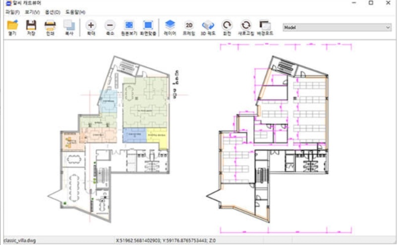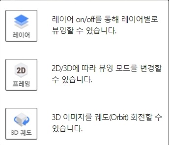 DWG, DWF, DXF 등의 다양한 2D, 3D 캐드 이미지를 간편하게 레이어 기반으로 조회가 가능합니다. 이미지를 회전할 수 있는 기능도 있으며 3D이미지의 궤도회전이 가능하고 배경을 사용자가 설정한 색으로 변경도 가능합니다.