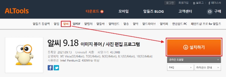 알씨의 경우에는 알씨 공식 다운로드 홈페이지 [알툴즈]에서 다운로드 하실 수 있습니다.