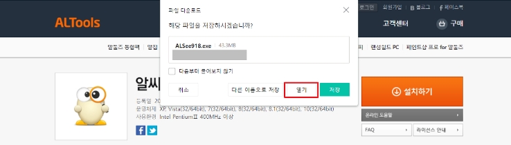 3.알씨 설치파일을 [다른 이름으로 저장] [열기] [저장] 중에서 고르셔서 실행하세요.