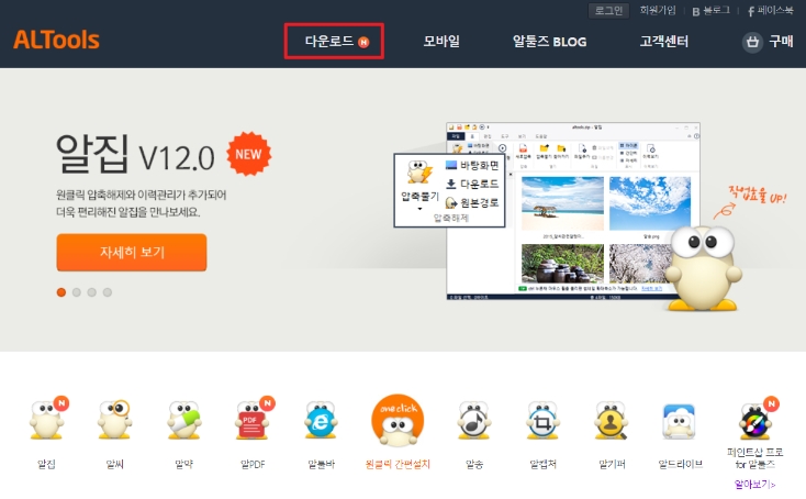 1.알툴즈 홈페이지 상단에 [다운로드]를 클릭하세요.
