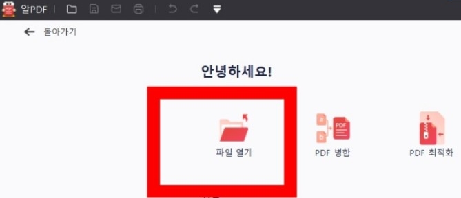 2. 알 PDF 프로그램을 설치 후 실행시켜주세요. [파일 열기]를 눌러서 한글파일로 변경하길 원하는 PDF 파일을 열어줍니다.