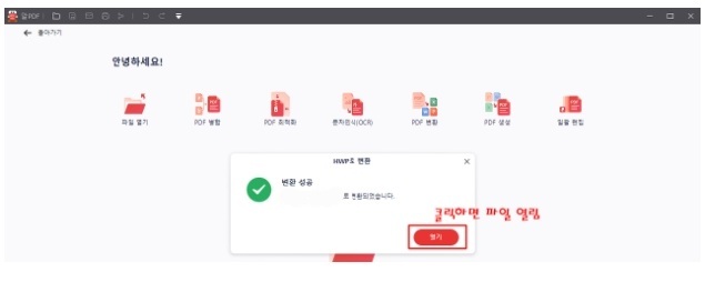 4.HWP로 변환 성공이라는 탭이 뜨면서 [열기] 버튼이 나오는데 이걸 누르면 한글파일로 변환된 파일이 열리게 됩니다.