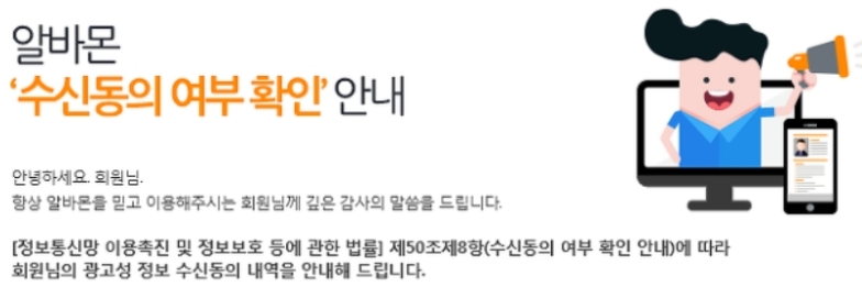 - 마케팅 수신은 정보통신망 이용촉진 및 정보보호 등에 관한 법률에서 누구든지 전자적 전송매체를 이용하여 영리목적의 광고성 정보를 전송하려면 그 수신자의 명시적인 사전 동의를 받아야 한다고 규정하고 있습니다.