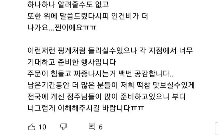 아래 글은 떡참 가맹점주가 배달료 인상으로 인해서 부정적인 댓글이 많아서 호소문을 올리셨습니다.