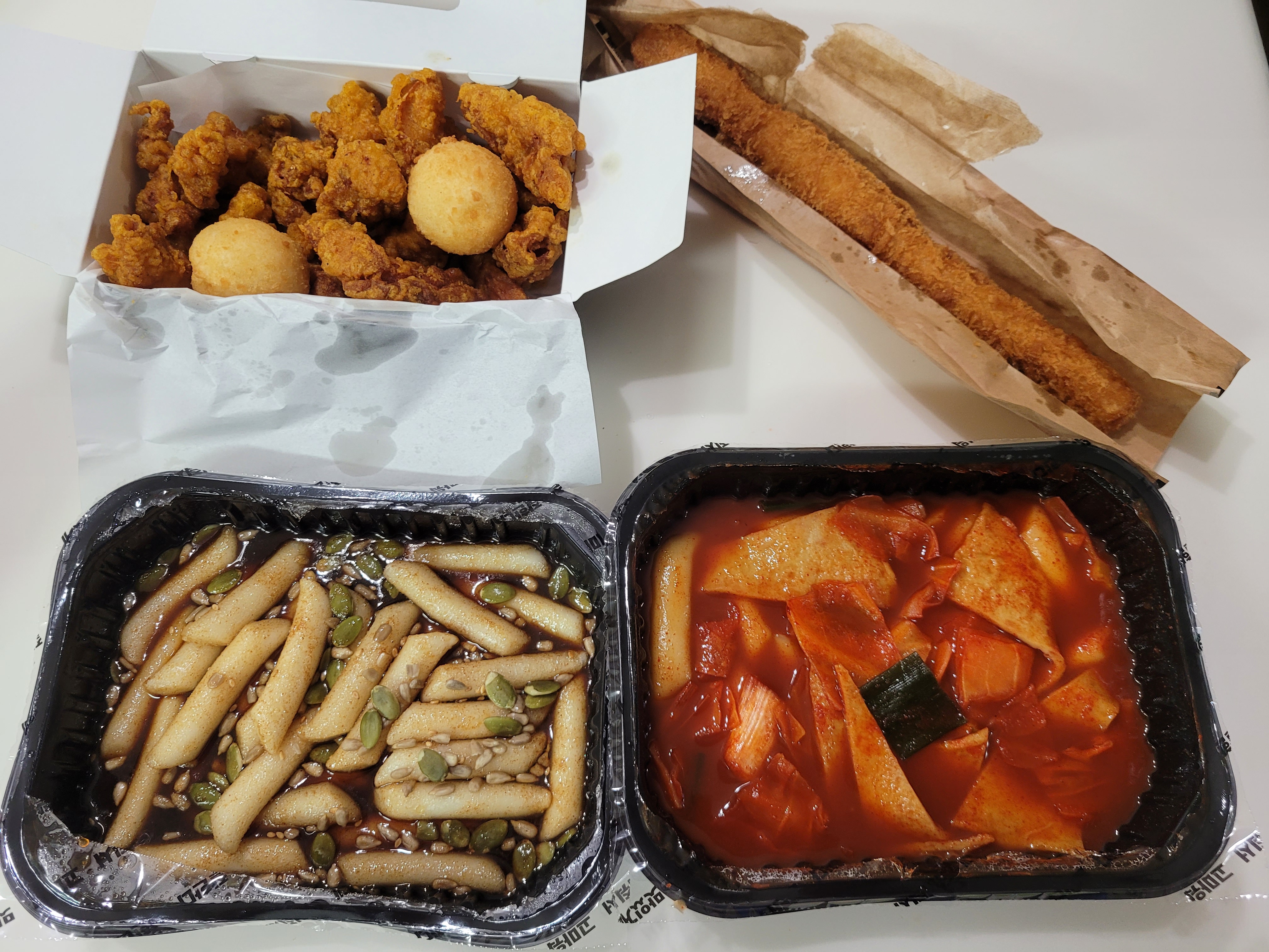 저는 17시 이후에 주문해서 받아왔기 때문에 [떡볶이 + 치킨한박스 + 치즈볼 + 쿨피스 + 씨앗호떡볶이 + 대빵찡어]를 받아왔습니다.