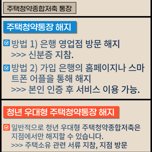 은행 영업점에 신분증을 지참해 방문하거나 가입 은행의 홈페이지나 스마트폰 어플을 통해 신청하면 접수 즉시 해지가 완료됩니다. 단, 일반적으로 청년 우대형 주택청약종합저축은 지점에서만 해지할 수 있습니다.(주택소유 관련 서류를 가지고 지점 방문)