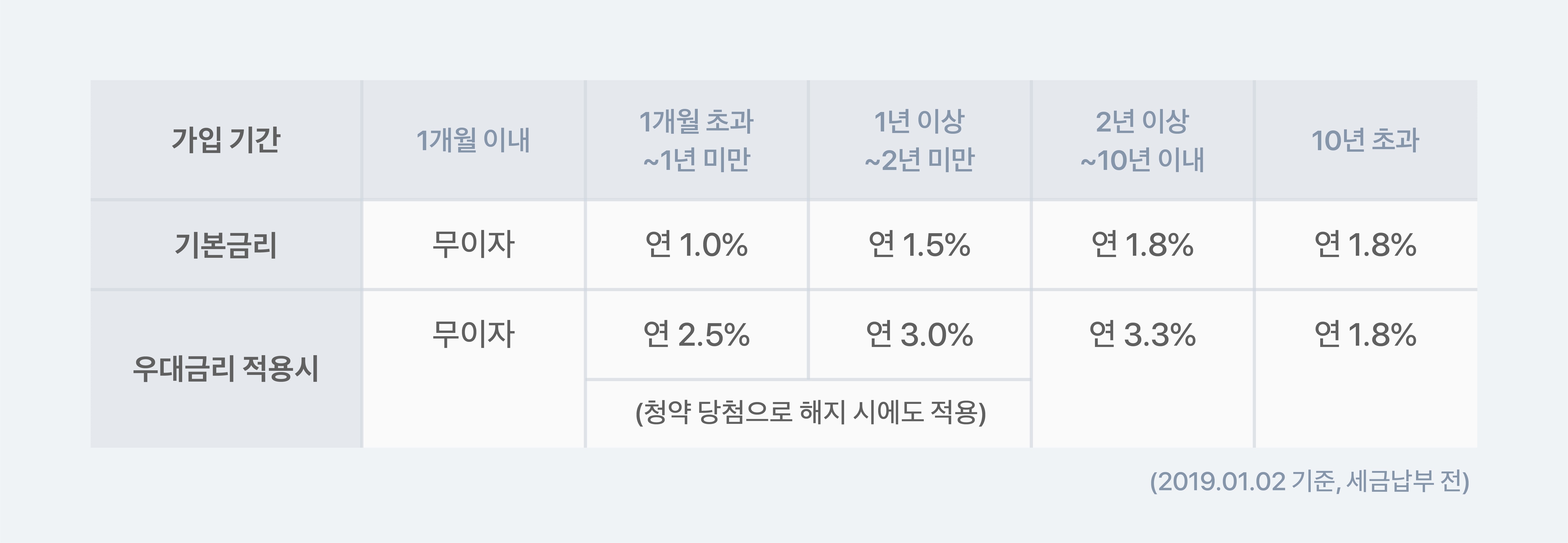 청약통장은 만기가 없기때문에 계속 이자가 붙게 되는데 해지 시점의 이자율을 일괄적으로 적용하는게 아닙니다. 만약 주택청약종합저축통장을 3년을 가지고 있다가 해지를 하면 1년 치는 1%, 이후 1년 치는 1.5%, 그다음 2년 넘게 가지고 있던 기간 동안은 1.8%를 적용, 이를 합산해 받는 구조입니다.