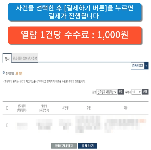 • 판결문을 모두 확인해 보기 위해선 원하는 사건의 체크박스를 선택하고 결제하기 버튼을 눌러 결제를 완료해야 합니다.