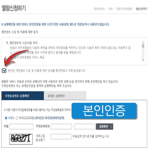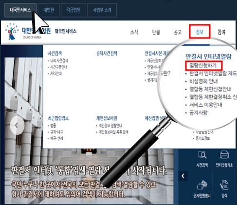 • 하위 카테고리 항목에서 [정보 -> 판결서 인터넷 열람 -> 열람 신청하기] 순서대로 클릭
