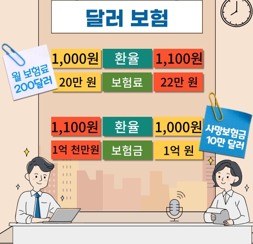 예를 들어 월 납입해야 하는 보험료를 200달러로 계약했다면? 환율이 1달러에 1,000원일 때는 보험료로 20만 원만 내면 자동으로 환전돼 200달러의 보험료가 들어가겠지만, 환율이 1달러에 1,100원으로 오른다면 전달보다 보험료도 상승해 22만 원을 내야 보험료 200달러를 채울 수 있는 상황에 처해질 수 있습니다.