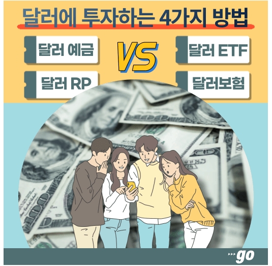달러보험은 앞서 알아본 달러 예금, 달러 RP, 달러 ETF와는 성격이 조금 다른 상품입니다. 달러보험은 보험사에서 달러에 투자하는 상품으로, 보험료를 달러로 내고 만기 시점에 보험금도 달러로 받게 됩니다. 때문에 환율이 오르고 내리고에 따라 납입해야 하는 보험료나 수령하는 보험금에도 차이가 있을 수 있습니다.