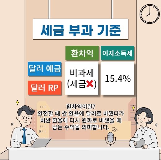 달러 RP는 수수료가 보통 은행의 10분의 1 정도로 낮으며, 이자 수익에는 15.4%의 세금이 붙지만 환차익으로 인한 수익에는 세금이 붙지 않습니다. 달러 RP는 약정형과 자유 약정형이 있는데, 자유 약정형을 선택하면 언제라도 매매가 가능하고 수수료도 달러 예금보다 낮기 때문에 환율이 예상대로 올랐다면 단기간 동안 수익을 얻을 수 있다는 장점이 있습니다.