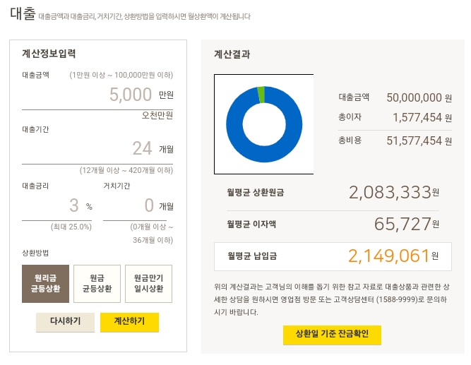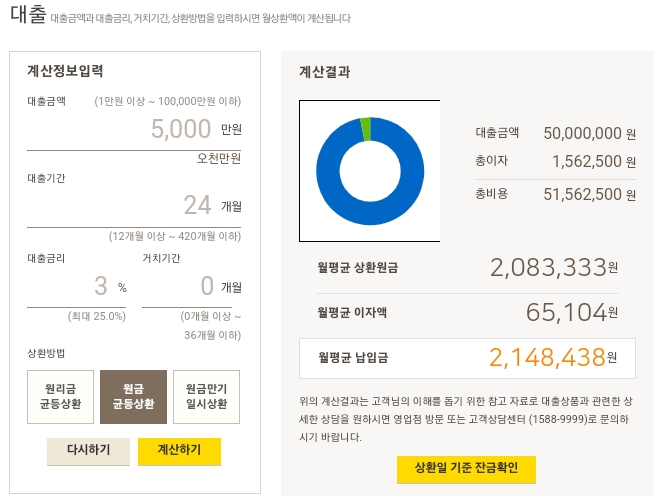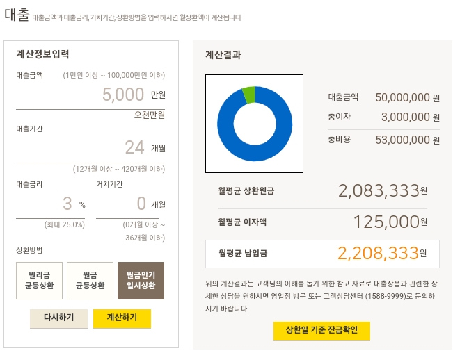 예) 대출금액(5천만원) 대출기간(24개월) 대출금리(3%)