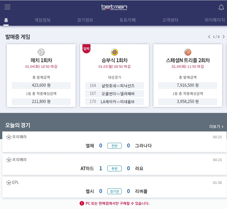 PC에서 구매하실 때는 www.betman.co.kr 에서 금액을 충전 후 구매가 가능하며 한 회차에 최대 5만원까지 구매가 가능하며 승부식 같은 경우 최소 2경기 ~ 최대 10경기까지 픽이 가능합니다.