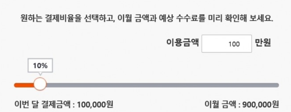 - 예) 신용카드 이용금액 100만원 -> 이번달 결제 금액 10만원 -> 이월 금액 90만원 | 이런 식으로 계산이 됩니다.
