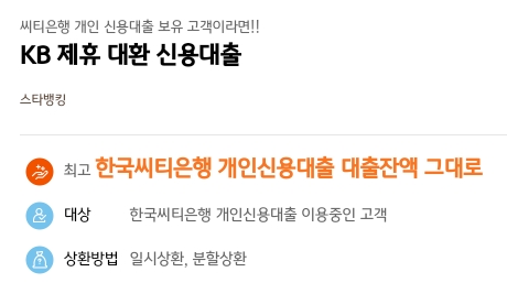 1. 상품특징 : 씨티은행 개인 신용대출 보유 고객을 위한 씨티은행 제휴 대환 신용대출