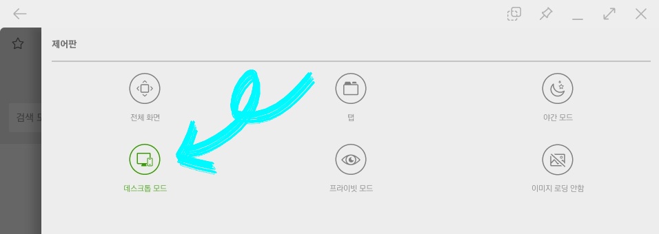 3) [전체화면] [탭] [야간모드] [데스크톱모드] [프라이빗모드] [이미지로딩안함] 이런 화면이 나오는데 여기서 [데스크톱 모드]를 클릭해서 활성화 시켜주셔야 합니다.