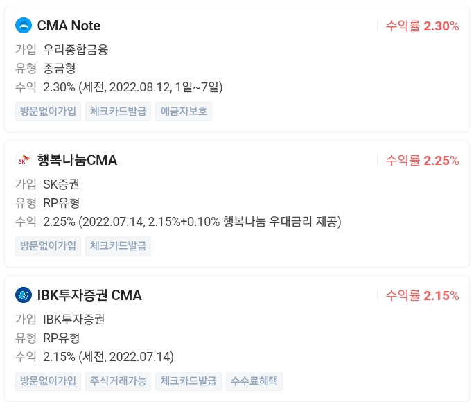 | 우리종합금융 CMA Note 연이자 2.30% 예금자보호 5천만원 (0) | 2022.08.15 |
